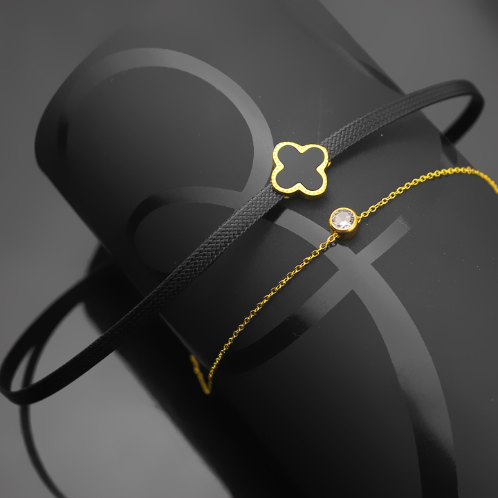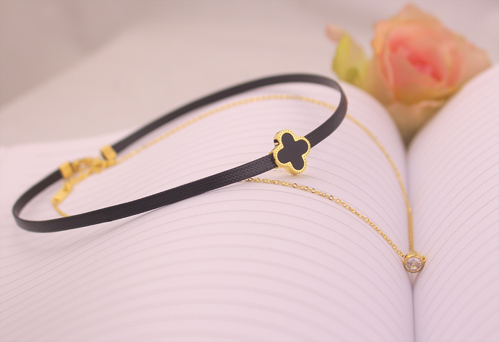 - Dây chuyền choker hoa bốn cánh 2 tầng được thiết kế rất đặc biệt. Tầng đầu tiên với vòng dây giả da màu đen ôm sát cổ đính thêm hoa 4 cánh với chất liệu đá đen. Tầng thứ 2 là sợi dây chuyền mảnh, mềm mại bằng chất liệu titan được đính viên đá trắng sáng. Sự kết hợp hoàn hảo này chỉ ngắm nhìn thôi đã thấy tuyệt rồi, được đeo lên vùng cô mảnh mai của các cô gái xinh đẹp nữa thì sẽ thích mê và muốn sở hữu ngay về với bộ sưu tập trang sức đấy.