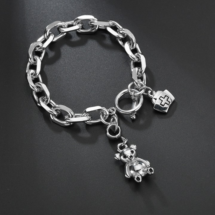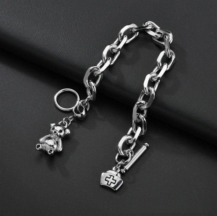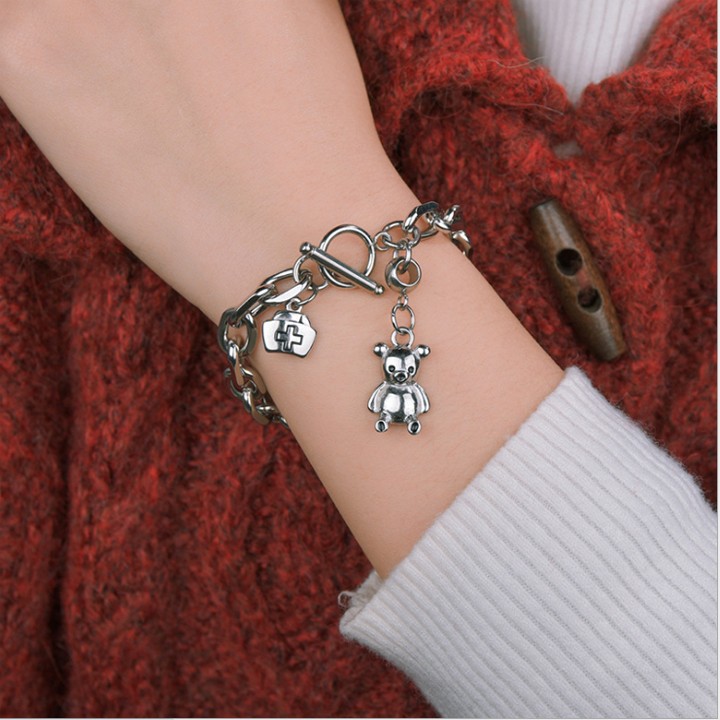 - Đầu nối còn lại của Lắc tay cá tính hình gấu là thiết kế hộp thuốc, khắc hình chữ thập. Đây lại là một hình ảnh cực kỳ độc lạ, hiếm gặp trong các mẫu trang sức khác. Chính vì vậy mà khi đeo Lắc tay cá tính hình gấu với những chi tiết sáng tạo, bạn trẻ đã thật sự gây được sự chú ý trong bất cứ hoàn cảnh nào, tôn lên được phong cách thời trang riêng biệt và sự năng động, cá tính.