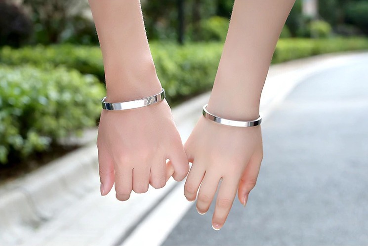 - Chiếc vòng tay dành cho nam có bảng rộng 8mm và vòng nữ nhỏ hơn với 6mm. Chỉ một chi tiết nhỏ đã làm toát lên sự hòa hợp và bền chặt của tình yêu, bạn nam mạnh mẽ và bạn nữ thêm duyên dáng.