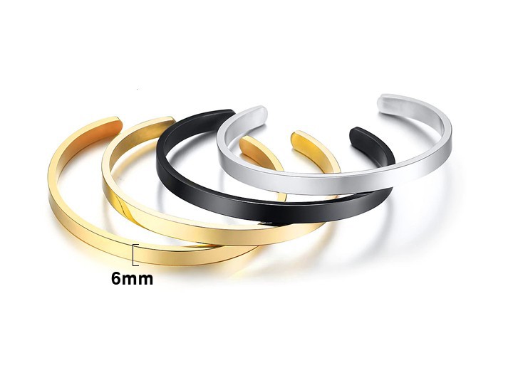 - Vòng tay inox nam nữ trơn hở hai đầu không chỉ có một màu trắng nguyên bản của inox mà còn có thêm ba màu khác cho bạn lựa chọn là màu đen, vàng hồng và vàng tươi. Cả 4 màu đều thích hợp cho cả nam và nữ. Màu đen vừa mạnh mẽ lại quyến rũ, màu vàng tươi thời thượng, vàng hồng nhẹ nhàng và màu trắng thanh lịch, nhã nhặn.