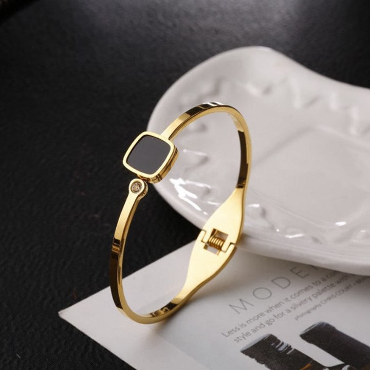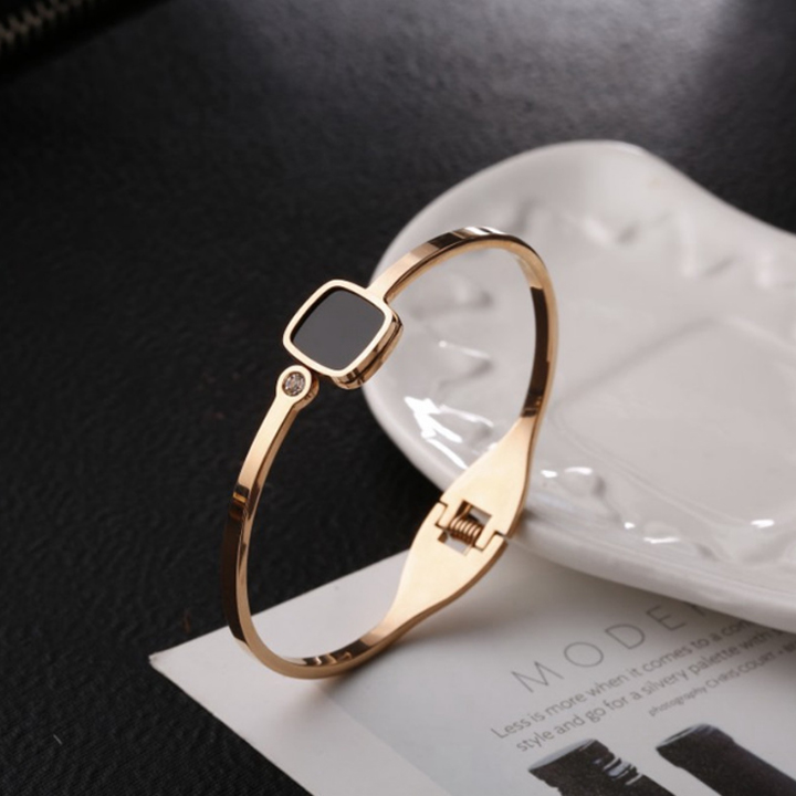- Vòng tay mặt vuông đá đen có 3 màu đặc trưng của các món trang sức titan là: Trắng sáng, vàng hồng, vàng tươi. Tùy sở thích, bộ trang phục được diện mà bạn trẻ có thể lựa chọn cho mình vòng tay màu thích hợp nhất.